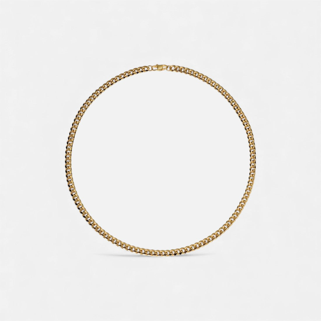 Weighing just right, the 6 mm-wide curb chain sits comfortably around your neck, offering a subtle yet sophisticated look. Made from durable 316L stainless steel and coated with 18CT gold plating, it’s designed to withstand everyday wear while keeping its shine intact.
