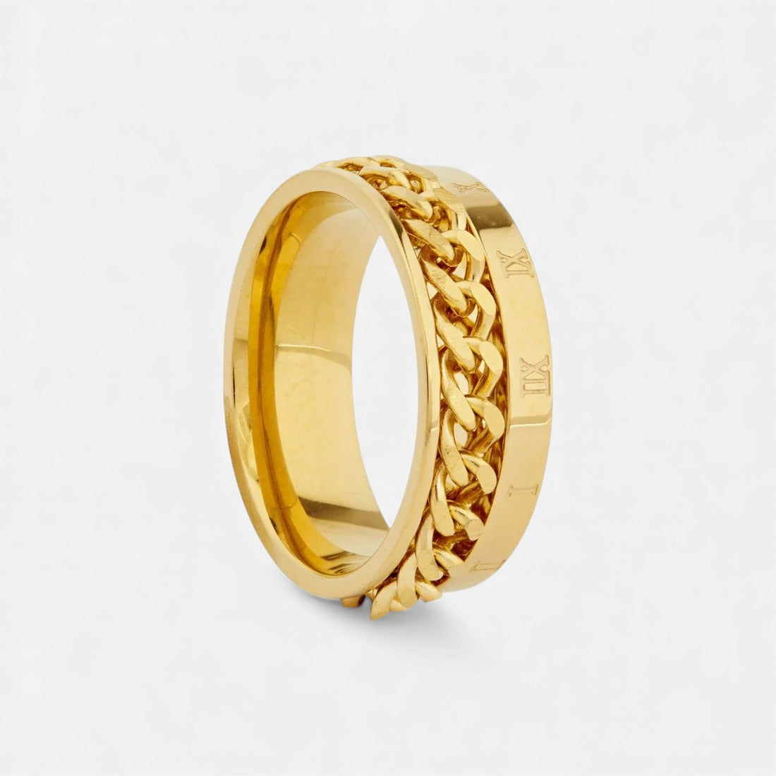 Bold sophistication meets subtle motion. This rotatable chain ring blends timeless Roman numeral engraving with an interlinked chain centerpiece, crafted from durable stainless steel and finished in radiant 18CT gold plating for a statement of enduring style.