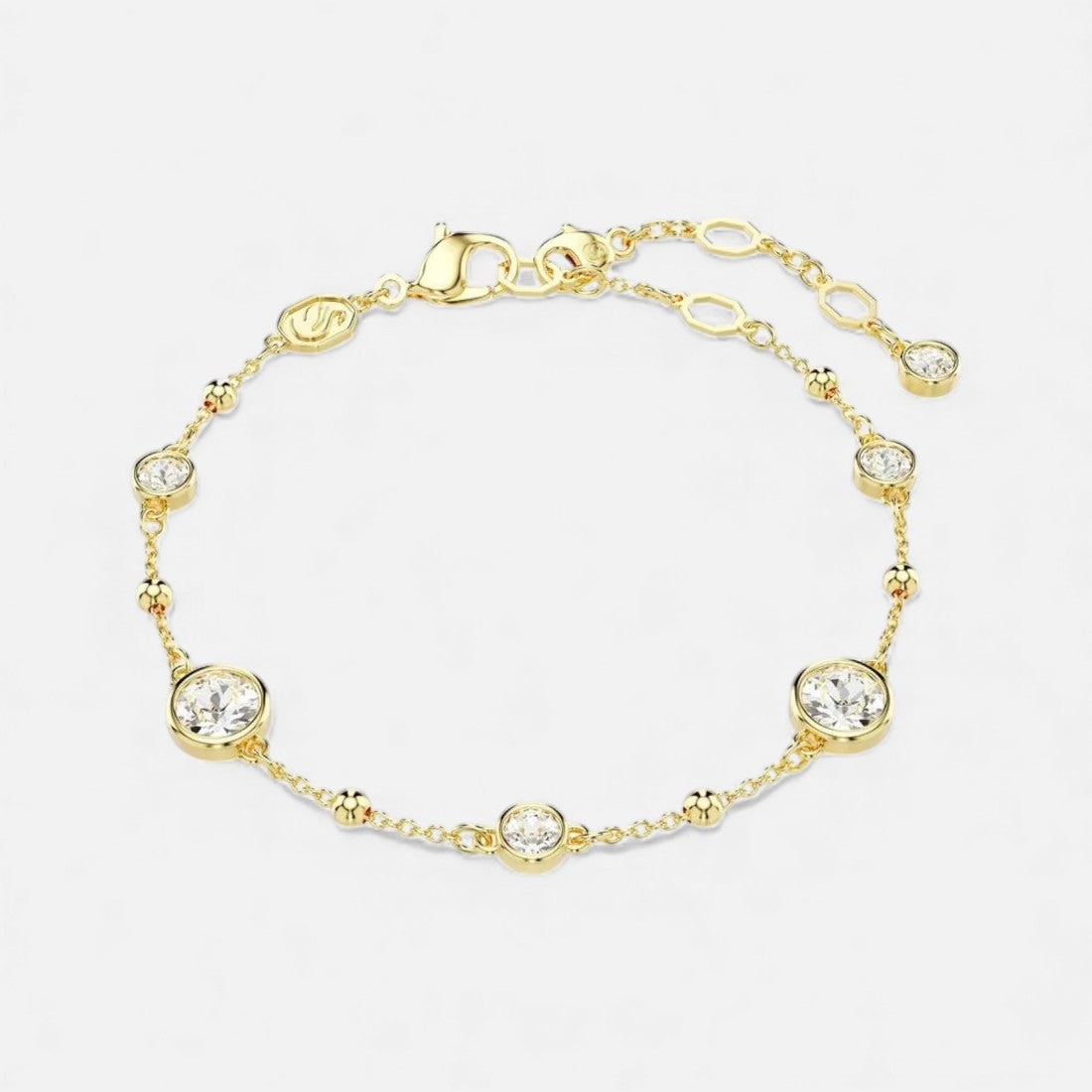 The delicate 1.8 mm chain is dotted with bezel-set crystal accents, wrapping elegantly around your wrist for a subtle, radiant sparkle. Crafted from 316L stainless steel with 18CT gold plating, it’s made to endure daily wear without losing its shine.
